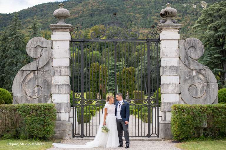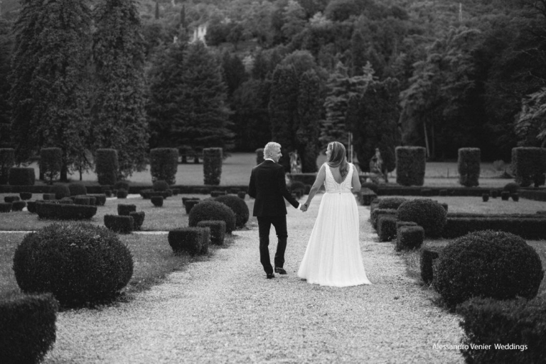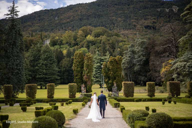 Le siepi in bosso dalle forme rettangolari e sferiche dividono le aiuole a prato dai vialetti in ghiaia, creando un ambiente elegante e raffinato capace di rendere unico qualsiasi set fotografico, speciale un aperitivo, o essere lo sfondo per una romantica proposta di nozze.